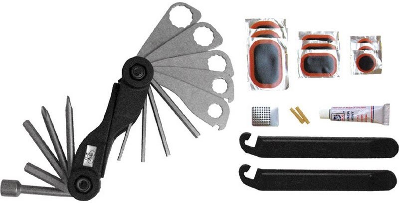 L-imbusový kľúč 4mm, nástrčný kľúč 8mm, očkové kľúče 9-10-12-13-15mm, montážne páky 2ks, ventilkové gumičky 2ks, záplaty 9ks (50x32mm - 3x, 33x22mm - 3x, O25mm - 3x), brúsny pliešok, lepidlo 6ml, nylonové púzdro
