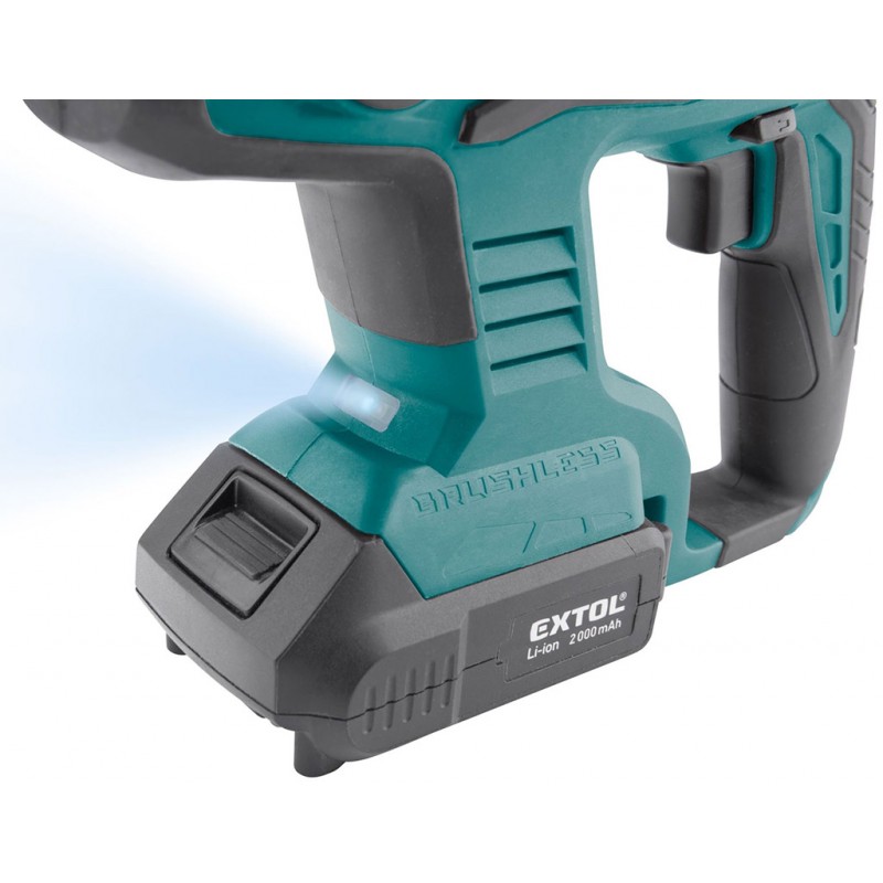 Aku vŕtacie kladivo je určené k rýchlemu vŕtanie do tehál a betónu pomocou vrtákov s SDS plus stopkou a menším sekacím prácam. Kladivo je poháňané najmodernejším "brushless" motorom. Tento nový typ motora má vyššiu životnosť, je výkonnejší a má menšiu spotrebu el. Energie ako klasické motory s uhlíkovými kefami. Vďaka pneumatickému príklepovému systému je schopné vŕtať oveľa rýchlejšie a efektívnejšie ako príklepové vŕtačky. Kladivo má zámok sekáča, takže si môžete pred sekaním sekáč nastaviť do patričnej polohy a pri sekaní bude kladivo udržiavať sekáč v tejto polohe. Jeho hlavnou výhodou je akumulátorový pohon, ktorý dovoľuje si vziať kladivo so sebou tam kde s ním potrebujete pracovať, bez ohľadu na to, či tam je rozvod elektrickej energie. Kladivo je vybavené spätným chodom pre ľahké vytiahnutie zaseknutého vrtáku a reguláciou rýchlosti, ktorú možno využiť podľa vŕtaného materiálu. Integrované LED osvetlenie má oneskorené vypnutie a svieti ešte niekoľko sekúnd po vypnutí kladiva. pre bežnú prácu postačujú jeden alebo dva 2000mAh akumulátory, ktoré môžete rýchlo nabiť v rýchlonabíjačke, pre náročnejších alebo dlhšej práci odporúča me väčšie akumulátory s kapacitou 4000mAh. Akumulátor možno použiť vo všetkých typoch náradia radu EXTOL SHARE20V. Vďaka použitej Li-ion technológii je ho možné kedykoľvek dobíjať, bez toho aby sa tým znižovala jeho kapacita. Li-ion akumulátor stráca energiu vplyvom samovybíjania veľmi pomaly a vydrží dlho nabitý a pripravený na použitie.