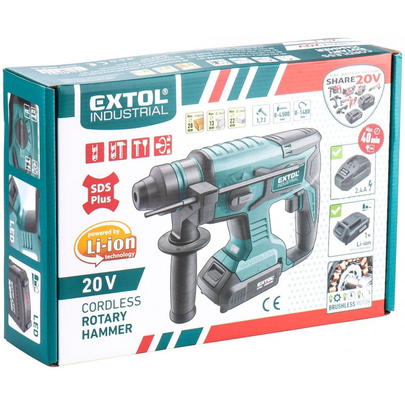 - Pro odeslání do Česka navštivte EXTOL INDUSTRIAL kladivo vrtací aku SHARE20V, 1,7J, SDS plus, BRUSHLESS, 20V Li-ion, 2000mAh 8791818