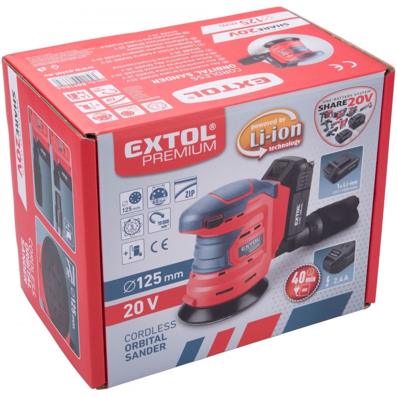 - Pro odeslání do Česka navštivte EXTOL PREMIUM bruska excentrická aku SHARE20V, 125mm, 20V Li-ion, 2000mAh 8891846