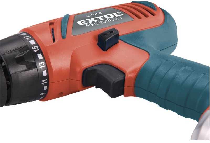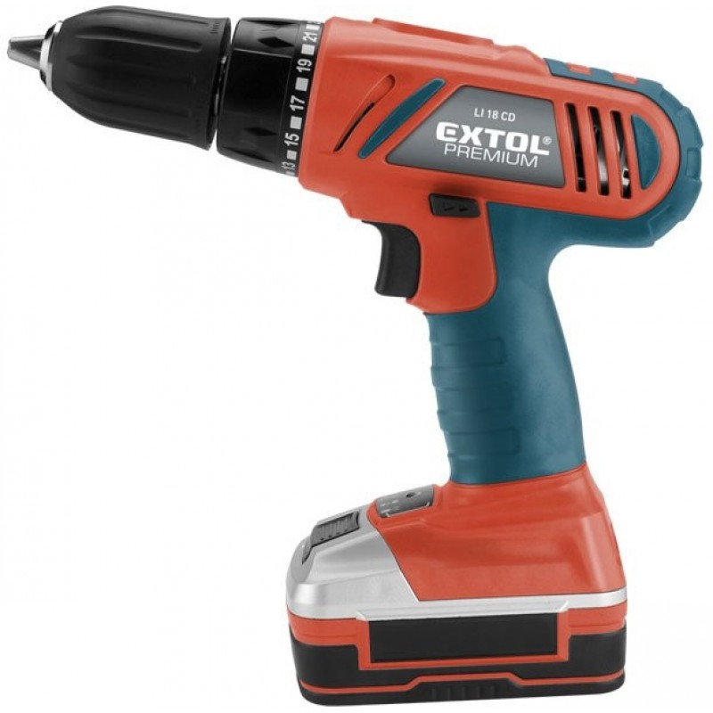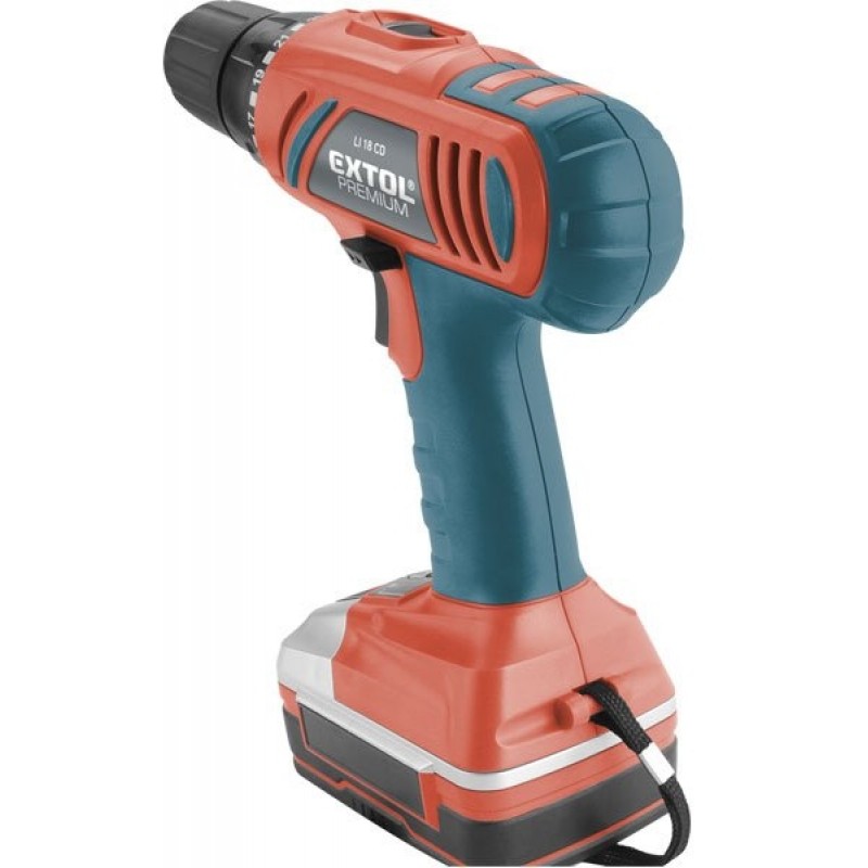 EXTOL PREMIUM LI 18 CD skrutkovač AKU 18V Li - ionAku vŕtací skrutkovač je určený pre domáce práce , najmä na vŕtanie do dreva , kovu a plastov a ďalej k doťahovanie a povoľovanie skrutiek , pričom vyniká veľkou uťahovací silou až 32 Nm . Zabudovaná LED dióda osvetľuje pracovné miesto a pogumovaná rukoväť ( SOFT GRIP ) zaručuje príjemnejšie a bezpečnejšie prácu . Svetelná signalizácia informuje o stave vybitia akumulátora . Aku skrutkovač je napájaný lítium iónovou batériou , medzi ktorej prednosti patrí nižšia hmotnosť , veľká výdrž a neexistujúce pamäťový efekt . Súčasťou príslušenstva je rýchlonabíjačka , ktorá rýchlo nabíja akumulátor ( za 1 hodinu až 70 minút zo stavu úplného vybitia ) , čo umožňuje rýchlejšiu prácu.