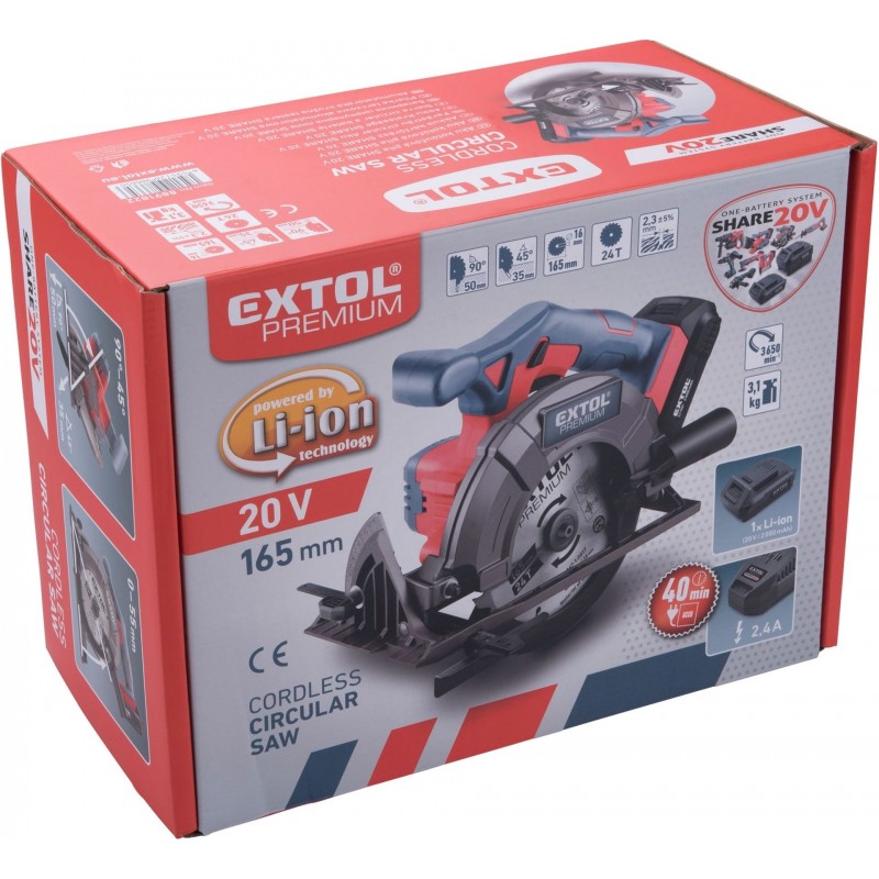 - Pro odeslání do Česka navštivte EXTOL PREMIUM pila kotoučová aku SHARE20V, 165mm, 20V Li-ion, 2000mAh 8891822