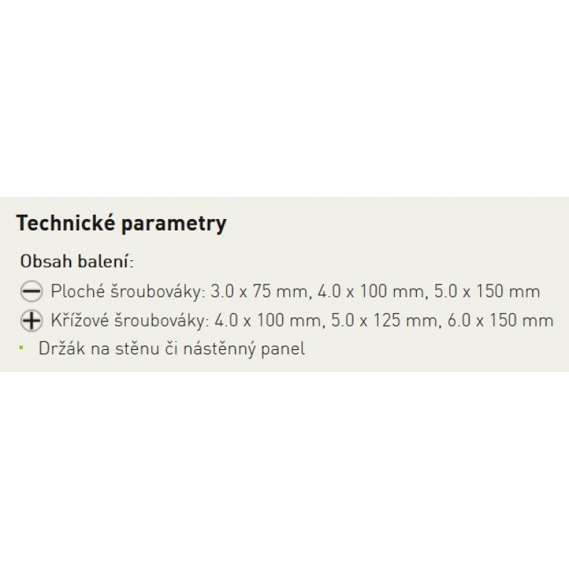 - Krížové skrutkovače: 4.0 x 100 mm, 5.0 x 125 mm, 6.0 x 150 mm