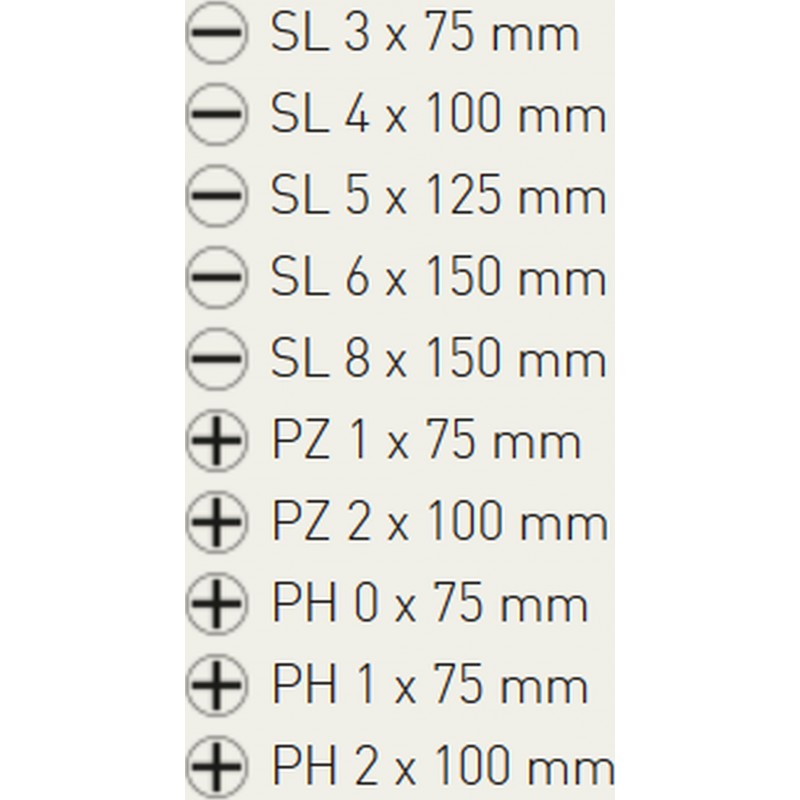 Sada skrutkovačov z CR-V materiáli, ktorý predstavuje vyššiu pevnosť materiálu a zaisťuje tak menšie opotrebovanie. Sada sa skladá z piatich plochých a piatich krížových skrutkovačov. Rozmery skrutkovačov sú vybrané tak, aby vyhovovali vrutům použitým v každej domácnosti.