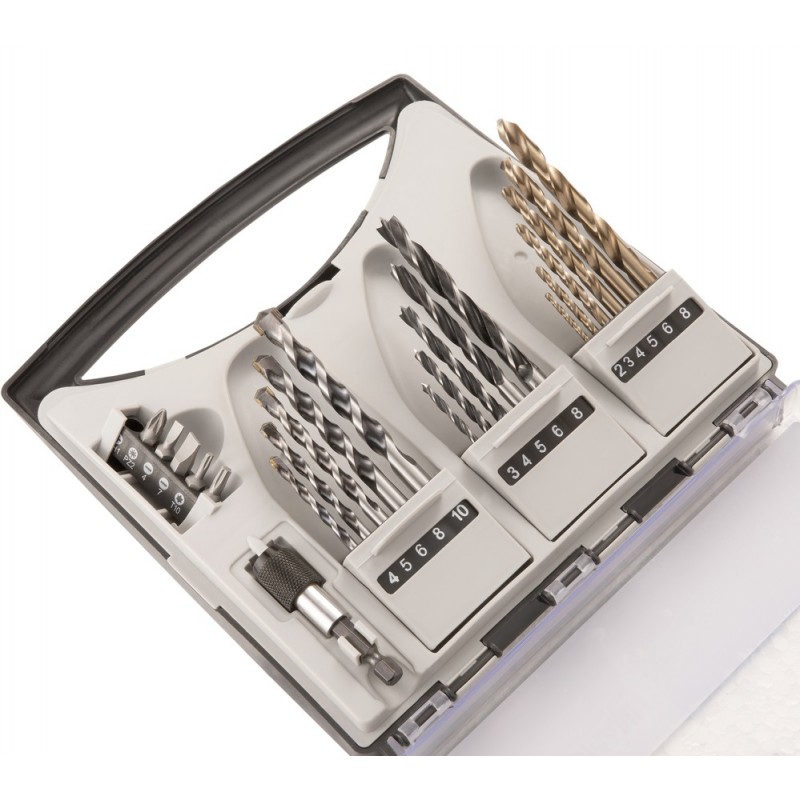 Sada vrtákov COBALT s bitmi vybavená šiestimi vrtáky do železa, päť do dreva a päť do muriva by nemala chýbať pri žiadnej vŕtačky. S vrtáky do muriva možno vŕtať aj pevnejšie materiály, len treba vrtáky riadne chladiť. Vylepšenia sady zpočívá aj v kobaltových vrtákoch do železa, ktorými možno vyvŕtať oveľa väčší počet dier ako s bežnými vrtáky, vrtáky je vhodné tiež chladiť. Sada tiež obsahuje šesť kusov bitov plochých a krížových, aby bolo napríklad možné pohodlne pripevniť konzolku nad okno. Vymeniteľná hlavica s točňou slúžia k presnejšiemu skrutkovanie.