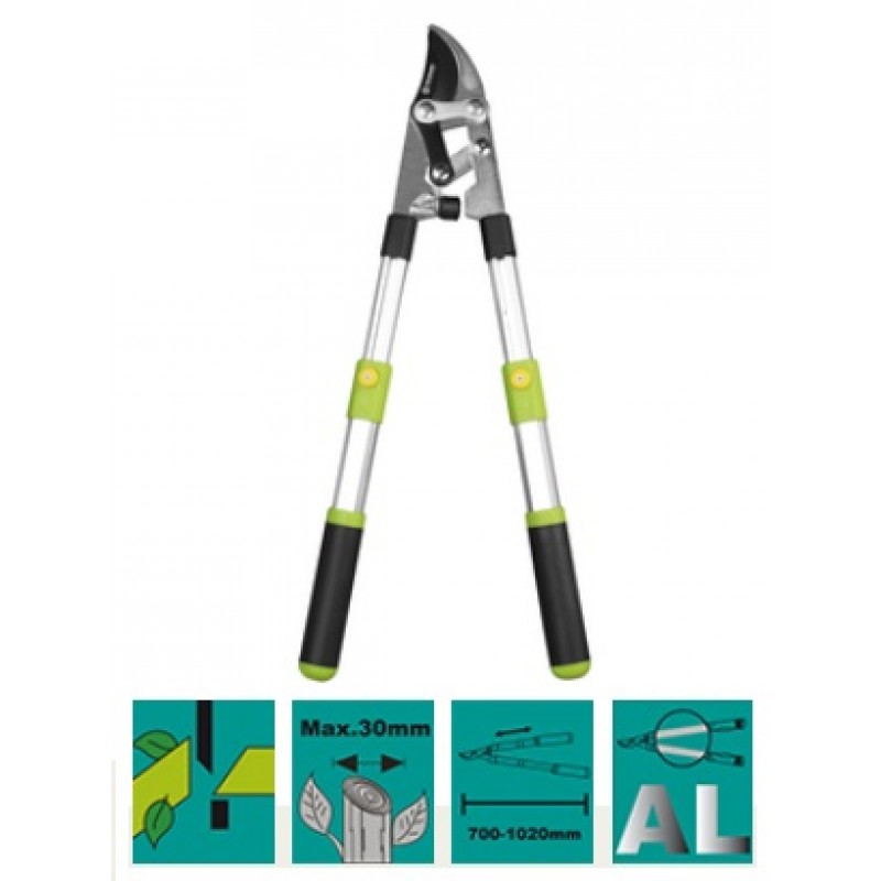 Teleskopické nožnice na konáre sa šmykovými strihacími čepeľami, ktoré dokážu ustrihnúť vetvy hravo do 30 mm. Komfortu strihanie veľmi pomáha dĺžka nožníc 700 až 1020 mm a tiež ich nízka hmotnosť vďaka rukovätiam zo zliatiny hliníka. Ergonomické úchyty s pogumovaným povrchom zaručí neskluznost aj námahou vlhších dlaňou.