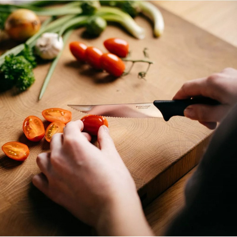 FISKARS Essential raňajkový nôž so zúbkovaným ostrím je praktický univerzálny nôž do každodenného použitia v kuchyni. Vďaka dĺžke čepele 12 cm a zúbkovanému ostriu je ideálny na krájanie potravín s chrumkavou kôrkou alebo šupkou, ako sú paradajky, bagety, pečivo či steaky.