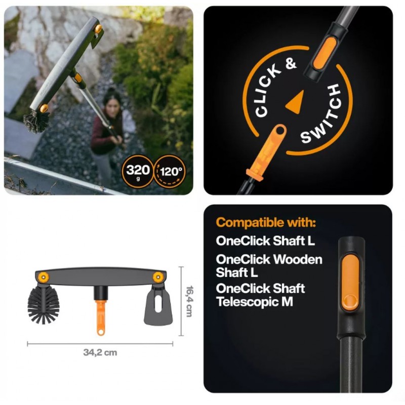 FISKARS Čistič okapov OneClick je všestranný a bezpečný nástroj pre údržbu strešných žľabov priamo zo zeme. Kombinuje škrabku na hrubé nečistoty a zaoblený kefa na dôkladné dočistenie. Nastaviteľný uhol pracovnej hlavy a teleskopická násada FISKARS OneClick umožňuje efektívnu a ergonomickú prácu bez použitia rebríka.