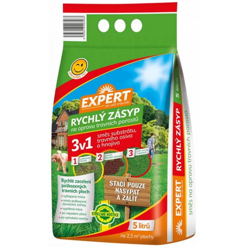 Expert Rýchly zásyp 3v1 patrí medzi revolučné výrobky na opravu trávnych plôch. Je vyrobený z kvalitného kokosového substrátu, trávneho osiva vybraných druhov rýchlo klíčiacich tráv a dvoch typov hnojív obsahujúce živiny ako v minerálnej, tak i organickej forme. Kokosový substrát dobre zadržiava vodu a zároveň si udržiava optimálnu vzdušnosť, čo podporuje klíčenie a vzchádzanie tráv. Vďaka zvoleným hnojivám (kombinácia minerálne a organické formy živín) je dosiahnuté pozvoľného uvoľňovaniu živín. Týmto je zaistená ako potrebná výživa pre novo vzchádzajúce trávny porast, tak i výživa následná, ktorá priaznivo podporuje odnožovania tráv, čo vedie k vytvoreniu dobre zapojeného a hustého trávneho porastu. Zloženie substrátu zaisťuje vytvorenie ideálnych podmienok pre rýchle klíčenie a vzchádzanie trávneho osiva a tým je dosiahnuté rýchle obnovy chýbajúceho trávneho porastu.Charakteristika: