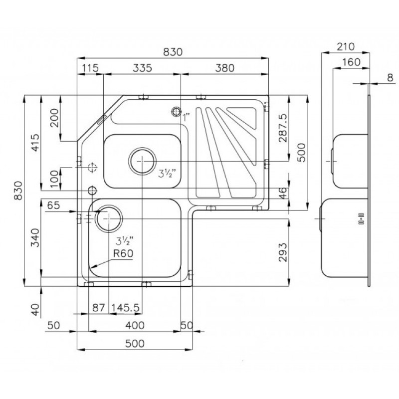 FOSTER nerezový drez rohový, STD 3308- Rozmer: 830x830 mm