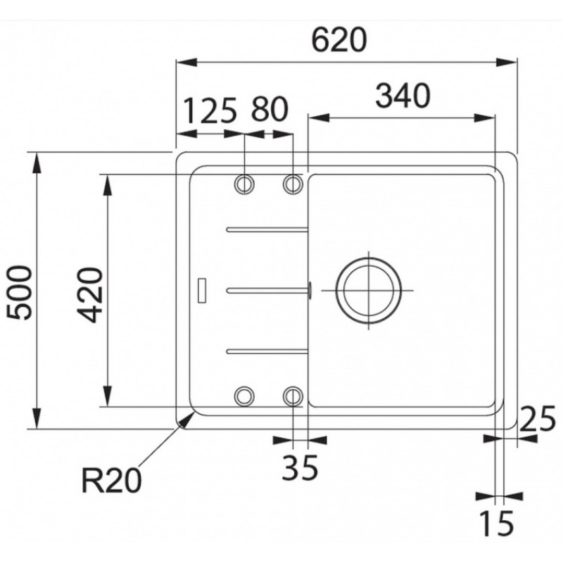 Franke Basis BFG 611-62, Fragranitový drez, ónyx 114.0285.105 / OTVOR - UŽ S vyvŕtanými otvormi NA BATÉRIU - odkvapkať VĽAVO - vanička VPRAVO.Rozmery: 620 × 500 mm