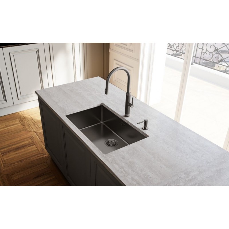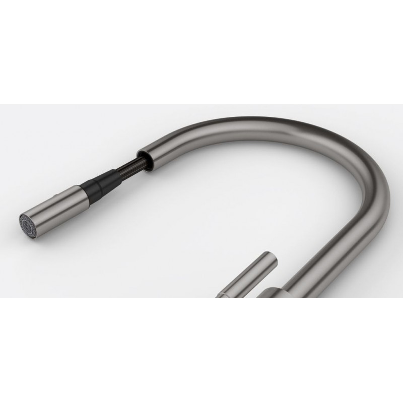 Otočná 360°. S vyťahovacou koncovkou osadenou perlátorom. S reguláciou Sprcha/Prúd. Opletená sprchová hadica 170 cm. Pripojenie Hadičky 55 cm. Prietok vody 7,74 l/min. (3 bar). Laminárny prietok vody. Nie je vhodná pre montáž do nerezových drezov.