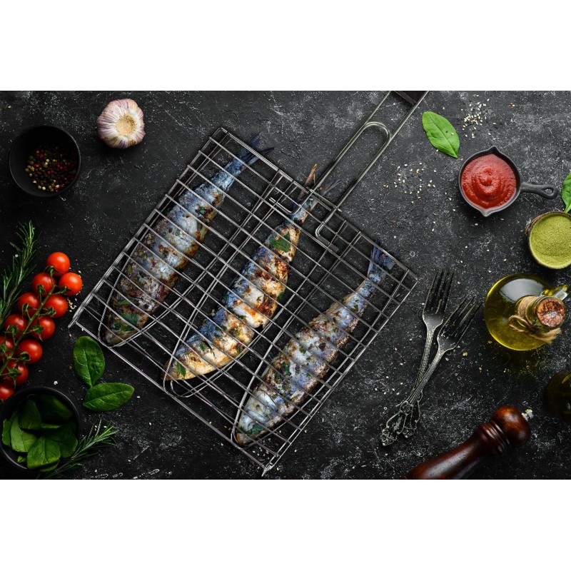 Vďaka šikovnému riešenia a možnosti uzavrieť rošt môžete ľahko a pohodlne čerstvé ryby otáčať aj s roštom a grilovať je tak z oboch strán. Vyhotovenie roštu umožňuje dokonalý a rovnomerný prístup tepla k rybám aj ich potieranie marinádou alebo olejom v priebehu grilovania. Vďaka vlnkovanému prevedenie grilovacích klieští na ryby sme znížili priľnavosť roštu, takže aj servírovanie hotových grilovaných rýb je jednoduchšie ako u iných, bežne používaných modelov.