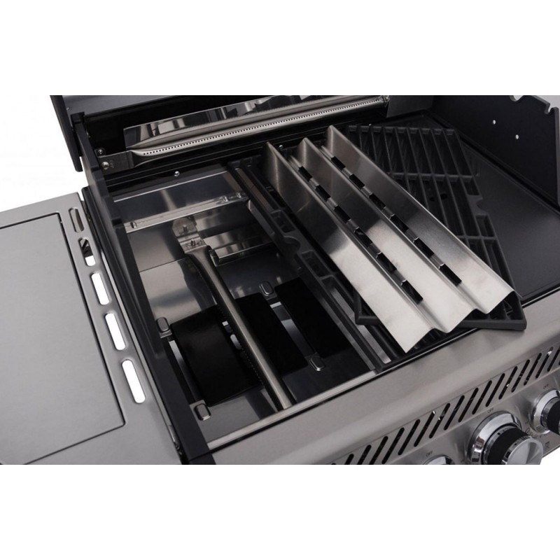 Gril má tiež dlhšiu životnosť horákov vďaka šikovnému systému Flame Tamer. Kovové profily, umiestnené priamo nad horákmi, zabraňujú odkvapkávaniu tuku medzi plameňmi a jeho vzplanutiu. Zároveň zabraňujú priamemu ohrevu mriežky iba v mieste horáka, takže sa celá mriežka vyhrieva rovnomerne.