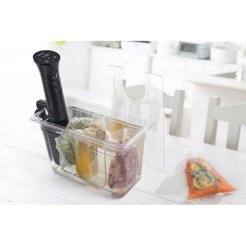 Ponorný pomalý varič G21 Maestro je skutočným majstrom v sous-vide varení vo vákuu. Je pripravený na každodenné bezpečné použitie a vyladený do najmenších detailov. Elegantné telo sa skladá z dvoch častí – ponorná časť s vnútornou varnou špirálou a vrchná časť s elektronikou a okrúhlym dotykovým displejom. Pre bezpečné zavesenie sús-vide variča G21 Maestro na okraj varnej nádoby sme ponorný varič vybavili háčikom s upínacou skrutkou.