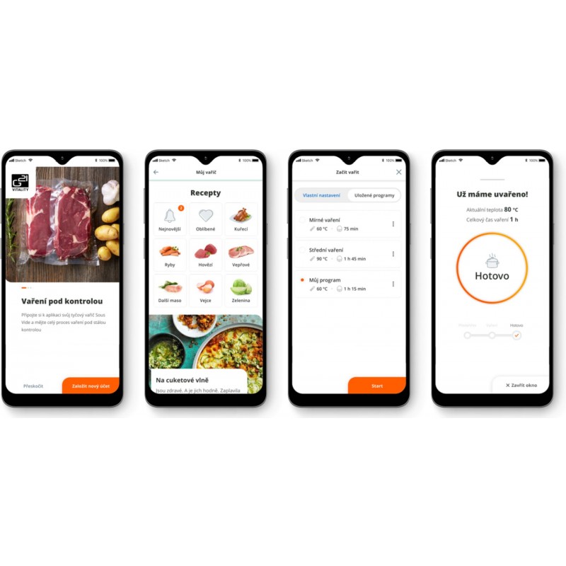 Príklad: Vložíte do hrnca s vodou zavákuované suroviny a odídete do práce alebo na výlet. Cestou si na mobile zvolíte recept a pošlite cez apku pokyn do sous-vide G21 Maestro. Po návrate môžete prestierať.