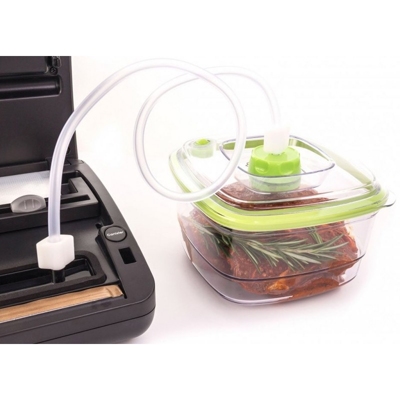 Vakuovačkou G21 Nefrit odsáva vzduch nielen z vákuovacích sáčkov alebo fóliou v rolkách, ale aj z vákuovacích marinovací dóz. Stačí napojiť hadičku na príslušný otvor vákuovacie dózy G21 (hadička je súčasťou balenia dózy) o objeme 1,4 alebo 2 l, stlačiť príslušné ovládacie tlačidlo a potraviny v dóze budú spoľahlivo zavakuované.