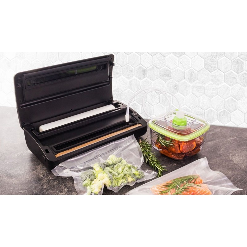 Vakuovačkou G21 Nefrit so zabudovaným zásobníkom fólie a rezačkou si už po prvom použití získa vašu obľubu. Pracuje na profesionálnej úrovni, je veľmi výkonná a spoľahlivá. Duálny pumpa zabezpečí dokonalé odsatie vzduchu a špeciálnej dvojitej zvary obal na zavakuované surovine spoľahlivo utesní. Mäso alebo ďalšie suroviny, pripravené pre varenie metódou sous-vide, sú tak vo vákuu chránené pred pôsobením vzduchu a výsledok bude chuťovo dokonalý, voňavý, bez straty prirodzených štiav, chuťou alebo farieb.