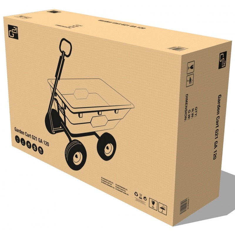 Pevná korba z tvrdeného odolného plastu je vhodná na prevážanie pevných, polotekutých či sypkých materiálov. Prakticky riešený výklopný mechanizmus uľahčí manipuláciu pri vykládke. Vodiacu tyč s rukoväťou je možné navyše jednoduchým krokom zmeniť na závesnú oj a vozík pripevniť za záhradný traktor. Celkovo je záhradný vozík G21 GA 120 veľmi dobre riešeným vozíkom, ktorý vďaka použitým odolným materiálom, pevnej konštrukcii a praktickej sklápacej korbe s objemom 120 l zastane väčšinu ťažkej práce pri presúvaní a prevážaní bremien s hmotnosťou až do 600 kg.
