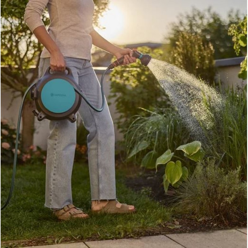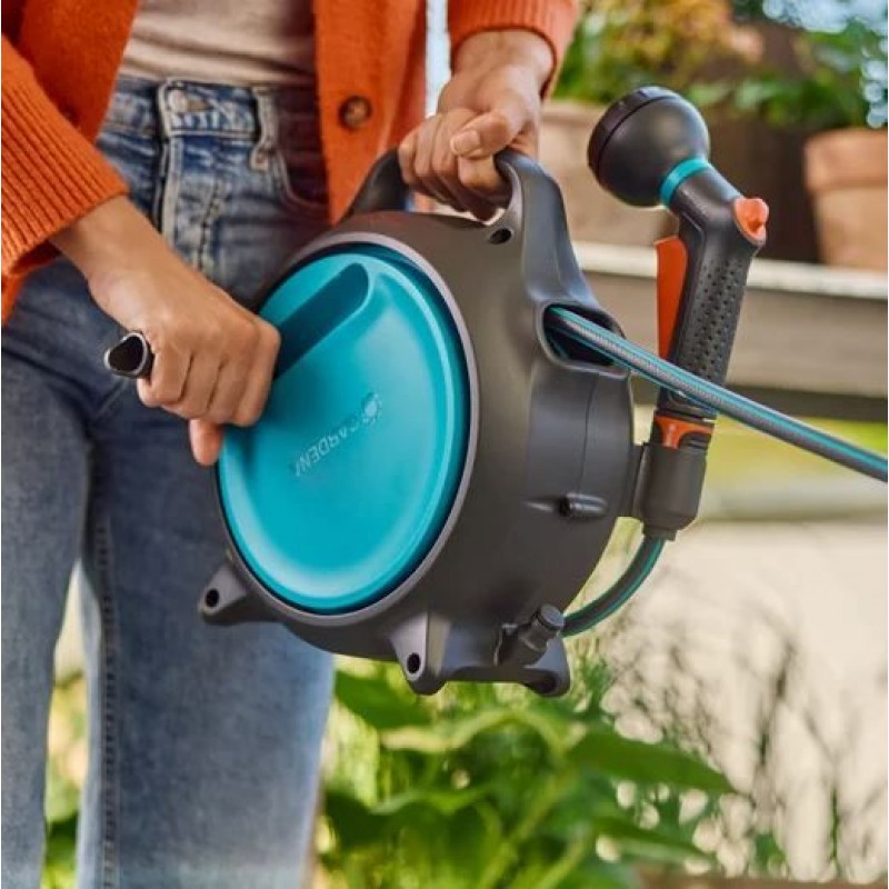 Sklopná kľuka umožňuje rýchle a pohodlné navinutie hadice po zalievaní, zatiaľ čo kompaktný dizajn zabezpečuje úsporné skladovanie aj v obmedzenom priestore.