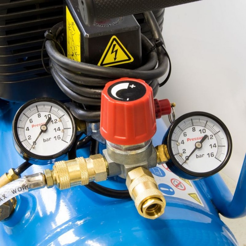 2 manometre, 2 výstupy stlačeného vzduchu (› kovové rýchlospojky), tlakový spínač, redukčný ventil, poistný