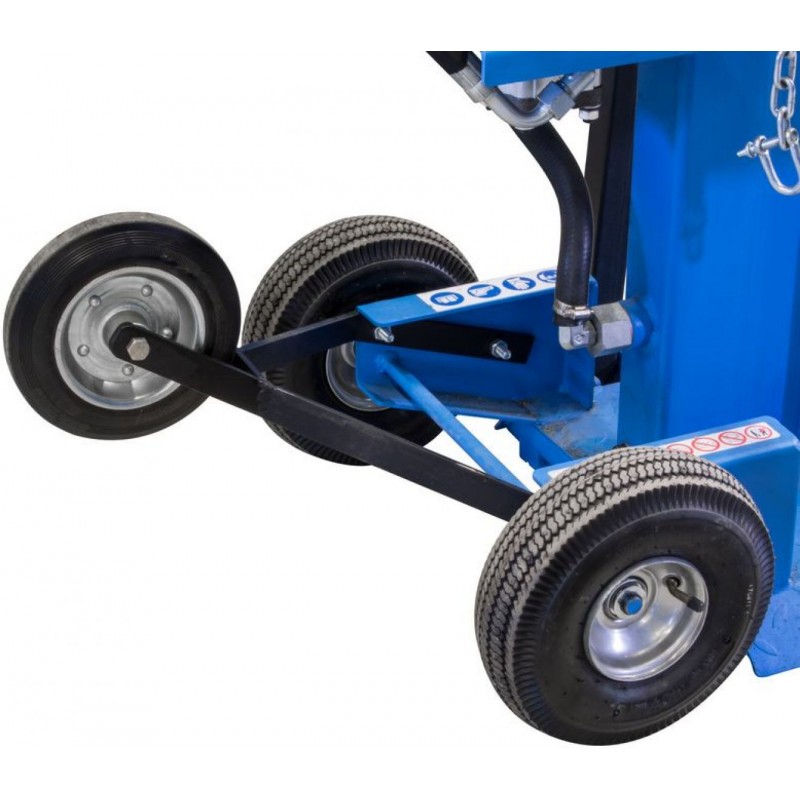 Konštrukcia: robustný oceľový rám, výkonné hydraulické čerpadlo, valec sa štiepacím nožom (zdvih piesta: 960 mm), prídržné rameno, stabilný (nízka) základňa, ťažná rukoväť, transportné kolesá (3).