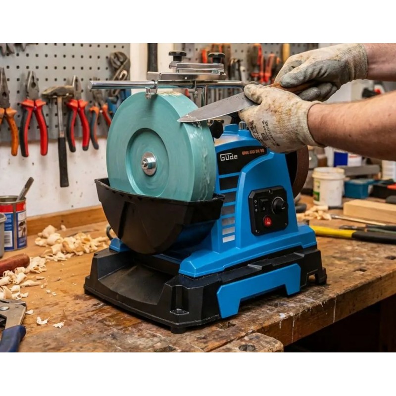 GÜDE GNS 250 DC VS je výkonná stolová brúska na mokré brúsenie nožov a náradia, ktorá umožňuje presné, šetrné a kontrolované ostrenie bez prehrievania ostria. Táto pomalobežná brúska s vodným chladením je vybavená reguláciou otáčok Vario-Speed a prepínateľným smerom chodu, vďaka čomu je ideálna na brúsenie nožov, sekier, dlát, hoblíkov aj ďalších rezných nástrojov.
