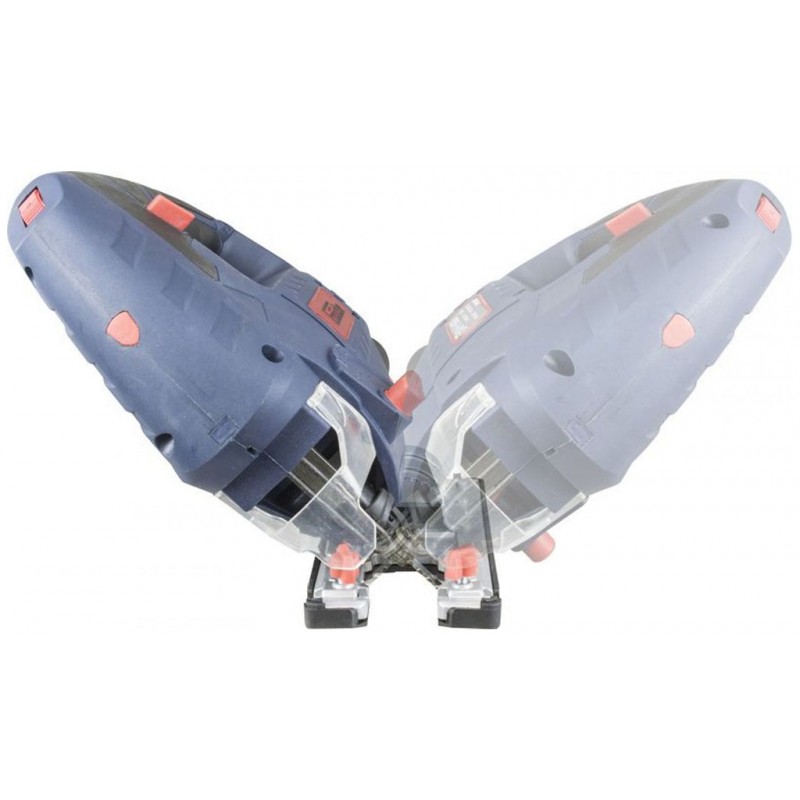 Presné nastavenie zdvihov podľa druhu rezaného materiálu (> 6stupňovej; rozsah: 800 - 3.000 min.-1); 4 polohový nastavenie predkmitu pílového listu; uhlové rezy (> naklápacie základová doska; 2 x 45 °).