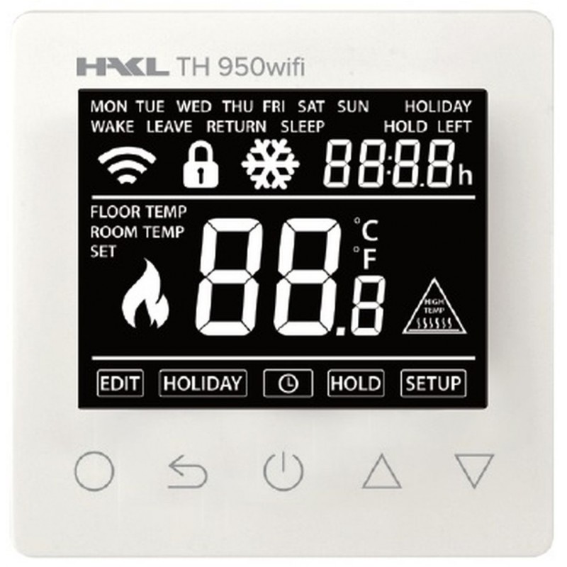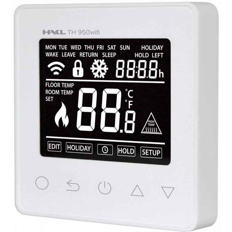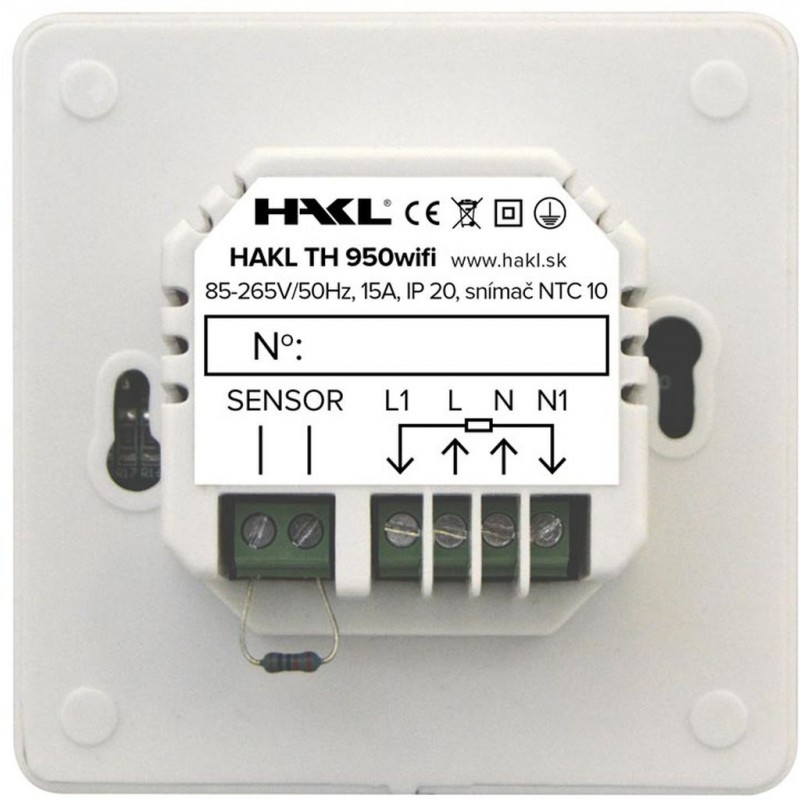 Termostat HAKL TH 950 WiFi pripojenie k internetovej sieti poskytuje inteligentný smart riešenie vašej domácnosti. Pomocou aplikácie v mobilnom zariadení môže termostat ovládať z akéhokoľvek miesta na svete pokrytým dátovým signálem.Termostat s vstavaným snímacom, predĺženým podlahovým snímačom, s programovateľným casovacom a dotykovým ovládaním. Pri týždennom cykle je možné nastaviť štyri casovej úseky na každý deň s rôznou teplotou. Termostat je primárne určený pre ovládanie dvoch teplôt, kde jedna je primárna a druhá limitovaná. Muža riadit podlahové