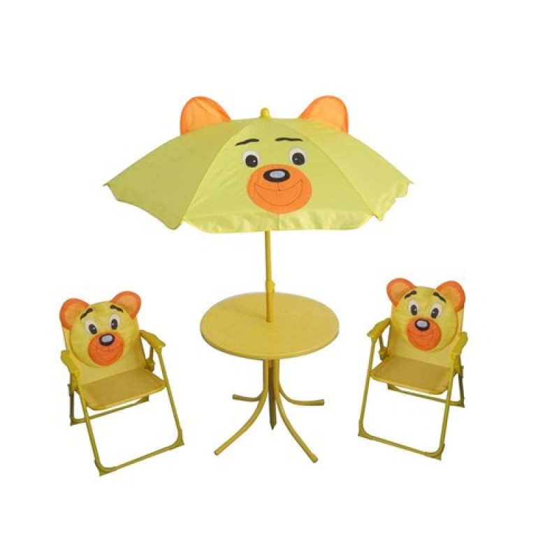 Detský kempingový set BEAR. Praktický a pohodlný na záhradu či terasu. Obsahuje 1 stôl, 1 slnečník a 2 kresielka.Priemer stola 50 cm