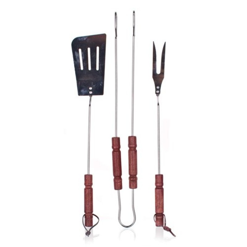 3-dielna sada grilovacieho náčinia obsahuje kliešte, obracačku a vidličku z pochrómovanej ocele. Rukoväť je z dreva.Dĺžka (cm): 46 / 46,5 / 44