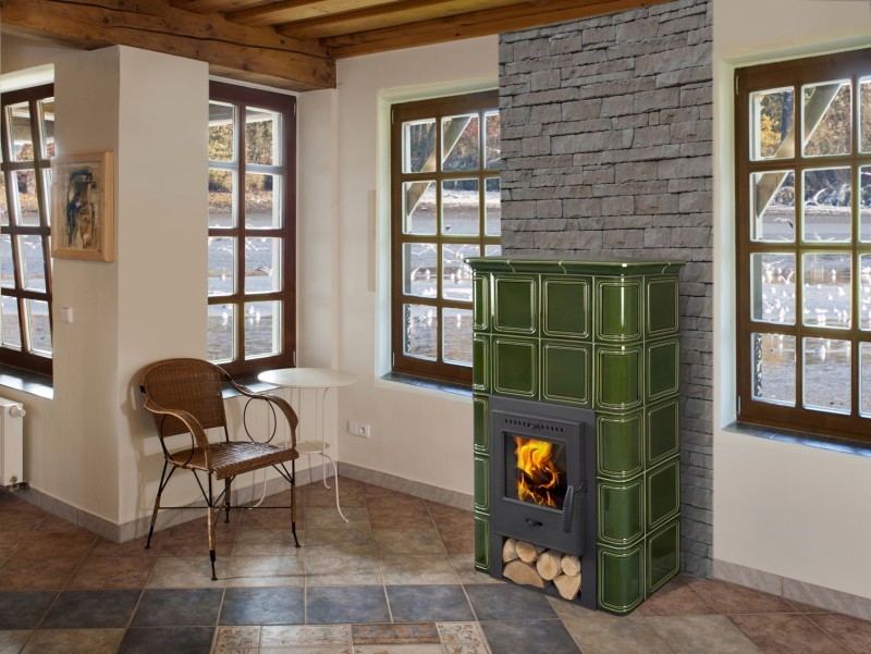 Hein Catania 1 H kachľová pec teplovzdušnáFarebné prevedenie na obrázku: 19301 zelená šumavská / korpus čierna 12.