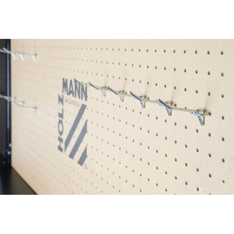Dielenský stôl HOLZMANN WT06 je praktickým riešením do dielní, garáží a domácich pracovných priestorov. Vďaka stavebnicovému systému je montáž veľmi jednoduchá. Veľká pracovná doska z MDF uložená na stabilnom plechovom podstavci zaručuje pevný a odolný pracovný priestor. Súčasťou je perforovaná stena s 20 háčikmi, ktoré je možné individuálne umiestniť pre prehľadné uloženie náradia.