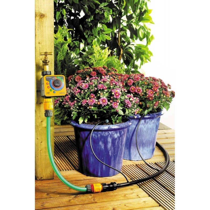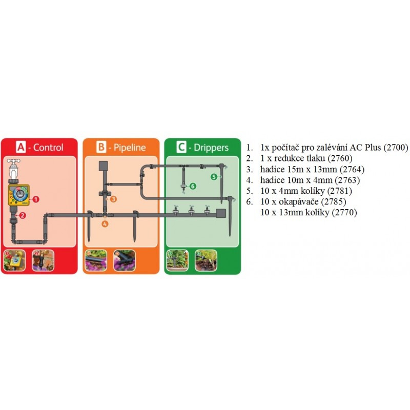 Sada obsahuje počítač pre zalievanie AC Plus, redukciu tlaku, 15 mx 13mm hadice, 10 mx 4mm hadica, 5 x 4mm nástenné svorky a 5 x 4mm kolíky, 10 x odkvapkávačov a konektorov.
