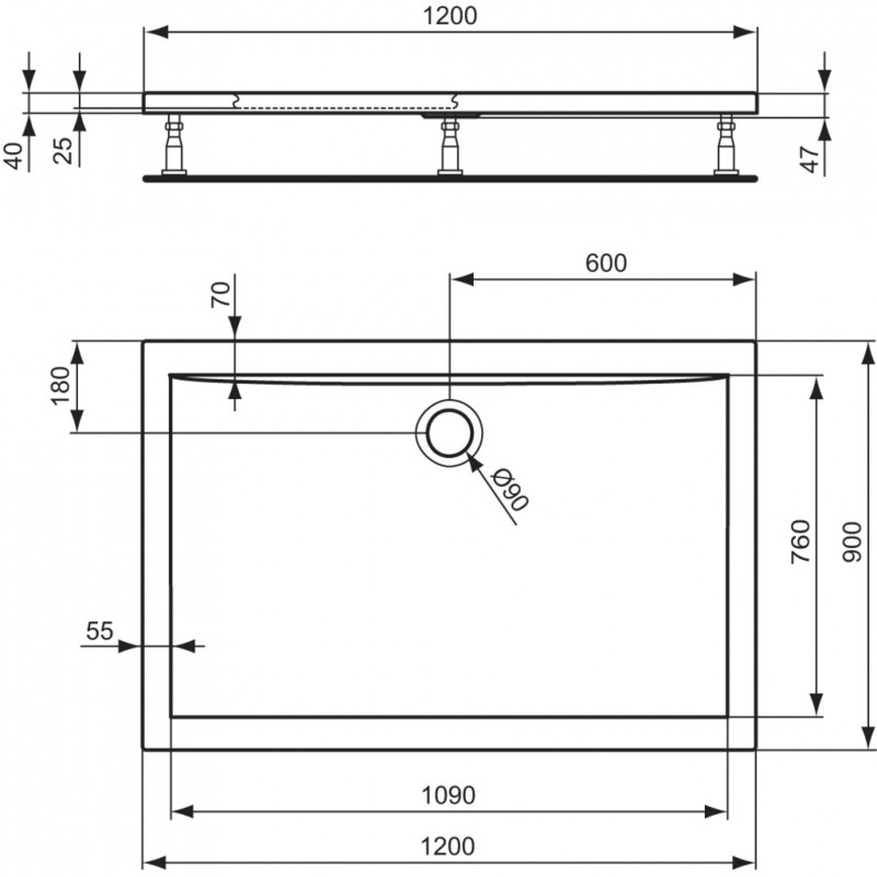 Ultra Flat obdĺžniková sprchová vanička zo sanitárneho akrylátu . Vyrobené podľa DIN 14527 . Vonkajší plášť vystužený skleným vláknom . Spevnený rám a dno vaničky . Odpad priemer 90 mm. Montáž - nohy k sprchovej vaničke a MEPA set .
