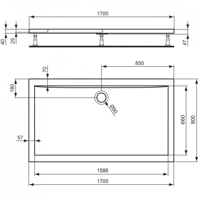 Ultra Flat obdĺžniková sprchová vanička zo sanitárneho akrylátu . Vyrobené podľa DIN 14527 . Vonkajší plášť vystužený skleným vláknom . Spevnený rám a dno vaničky . Odpad priemer 90 mm. Montáž - nohy k sprchovej vaničke a MEPA set .