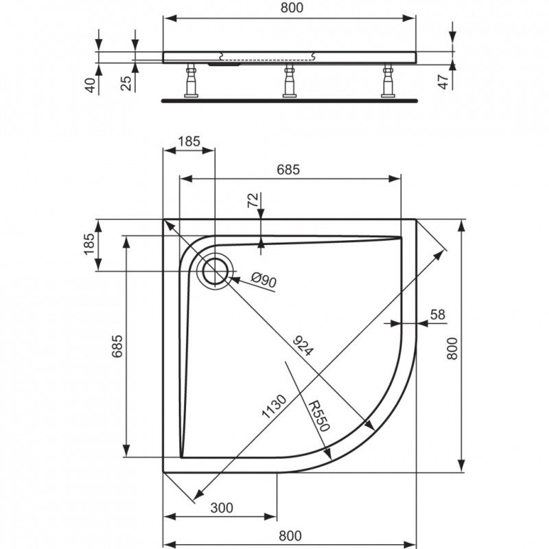 Ultra Flat štvrťkruhová sprchová vanička zo sanitárneho akrylátu . Vyrobené podľa DIN 14527 . Vonkajší plášť vystužený skleným vláknom . Spevnený rám a dno vaničky . Odpad priemer 90 mm ??. Radius 550 mm . Montáž - nohy k sprchovej vaničke a MEPA set .