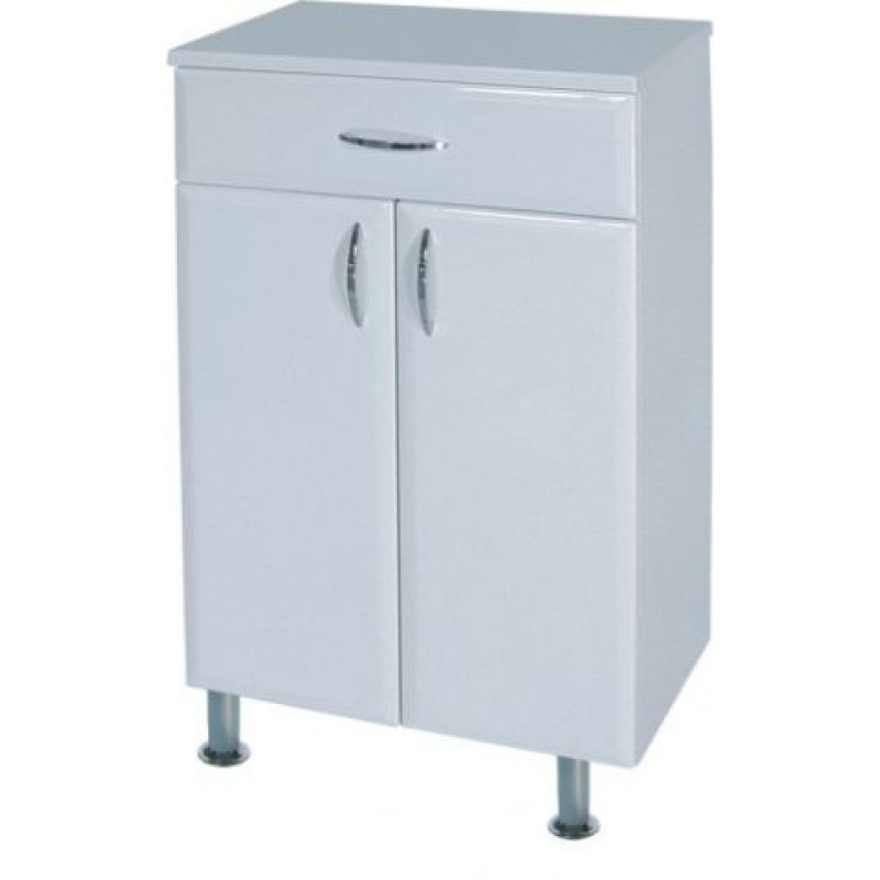 Kúpeľňový nábytok - nízka kúpeľňová skrinka na dvoch nožičkách, s jednou zásuvkou, za plnými dvierkami jedna staviteľná polica. Túto skrinku môžete objednať v prevedení Klasik/Variant nebo Azzurra, líšia sa len úchytkami. Venujte tomu pozornosť pri voľbe série.