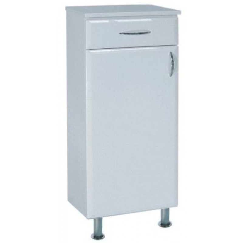 Nízka kúpeľňová skrinka na dvoch nohách široká 35 cm s plnými dvierkami, jednou zásuvkou a jednou staviteľnou policou je osadená celokovovými lesklými úchytkami K.