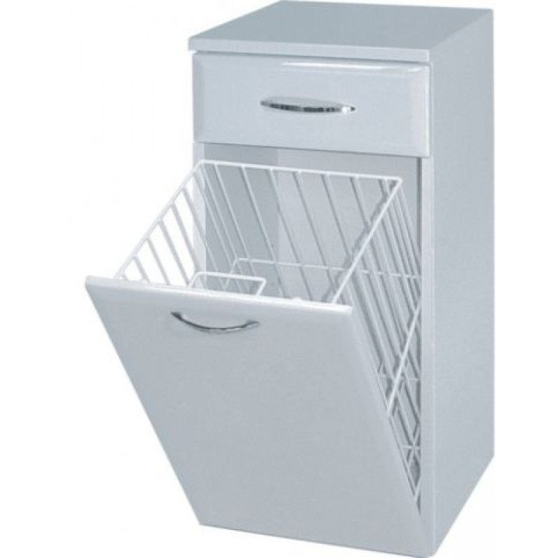 Závesná nízka kúpeľňová skrinka široká 35 cm s plnými dvierkami, jednou zásuvkou a košom na bielizeň je osadená celokovovými lesklými úchytkami K.