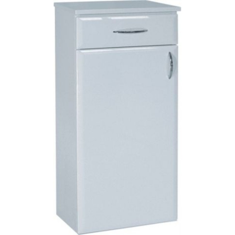 Kúpeľňový nábytok - nízka kúpeľňová skrinka závesná, ľavá, s jednou zásuvkou, za plnými dvierkami jedna staviteľná polica. Túto skrinku môžete objednať v prevedení Klasik/Variant nebo Azzurra, líšia sa len úchytkami. Venujte tomu pozornosť pri voľbe série.
