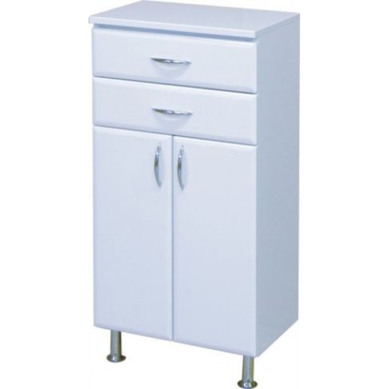 Kúpeľňový nábytok - stredná kúpeľňová skrinka s plnými dvierkami, na dvoch nožičkách, s dvomi zásuvkami, za plnými dvierkami jedna staviteľná polica. Túto skrinku môžete objednať v prevedení Klasik/Variant nebo Azzurra, líšia sa len úchytkami. Venujte tomu pozornosť pri voľbe série.