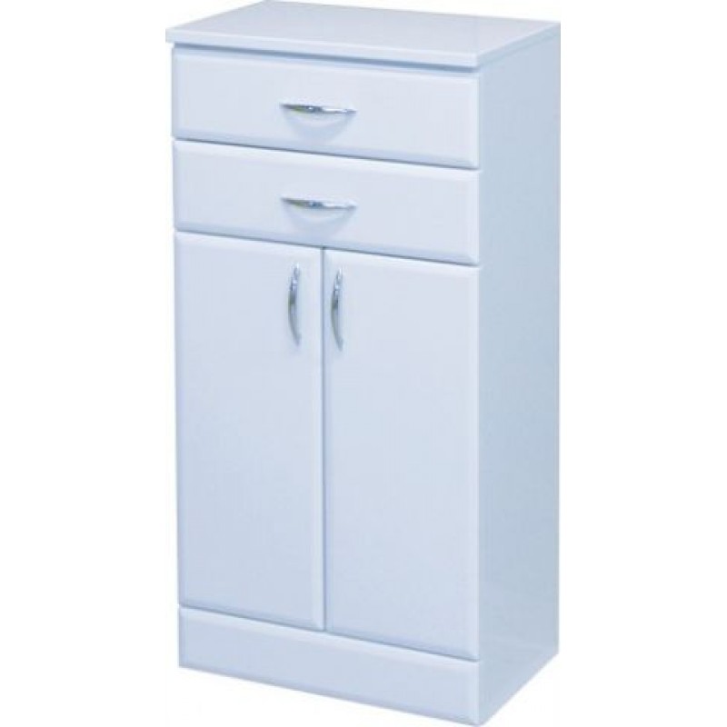 Kúpeľňový nábytok - stredná kúpeľňová skrinka s plnými dvierkami, na sokli, s dvomi zásuvkami, za plnými dvierkami jedna staviteľná polica. Túto skrinku môžete objednať v prevedení Klasik/Variant nebo Azzurra, líšia sa len úchytkami. Venujte tomu pozornosť pri voľbe série.