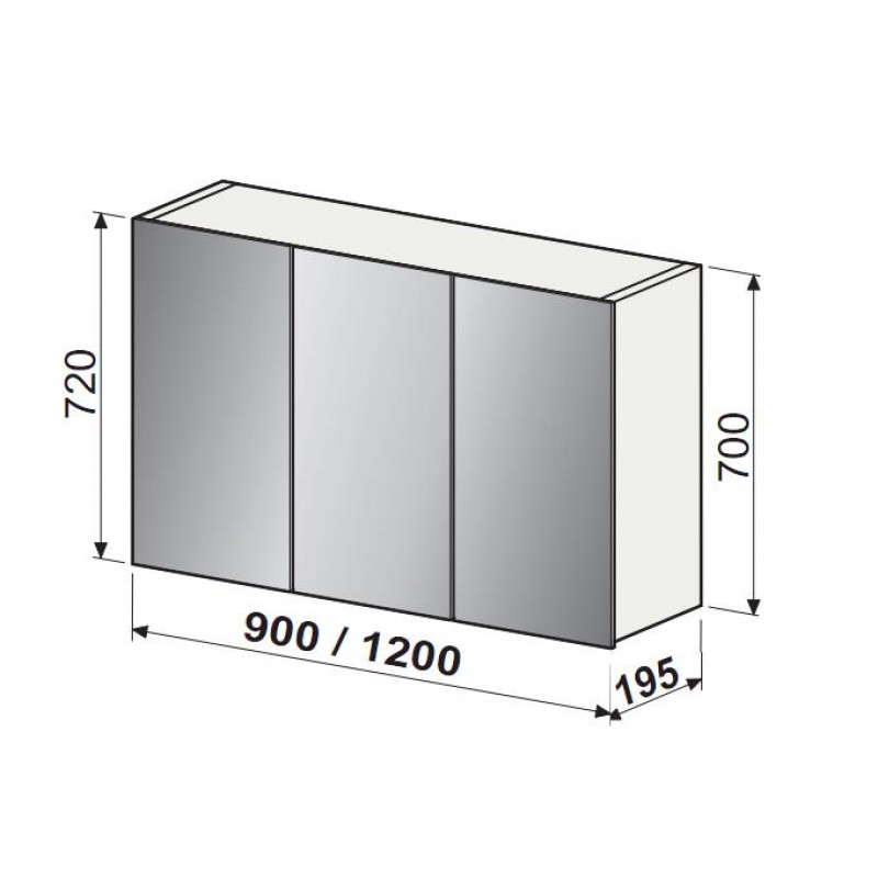 Kúpeľňová zrkadlová stena šírky 120 cm, obojstranná zrkadlové dvierka, za zrkadlovými otváracími dvierkami dve pevné police. Zásuvka s vypínačom (Berker) IP44 umiestnená zospodu zrkadlové skrinky.