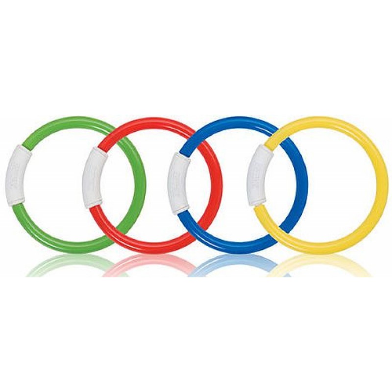 INTEX Potápačská hra súprava Dive Ring 155501Podvodné kruhy sľubujú veľa zábavy v bazéne pre veľkých i malých. Kruhy pozostávajú z mäkkého a flexibilného materiálu. Ako náhle ich hodíte do vody, postavia sa rovno na dne bazénu. Od 6 rokov.