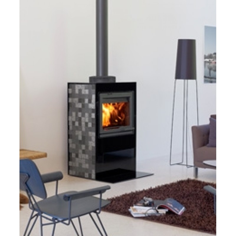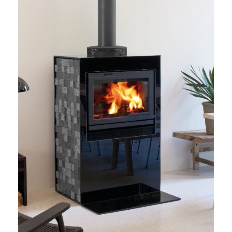 Jotul Cube 400 GL je voľne stojaca obstavba pre krbovú vložku Jotul I 530 - rovné sklo s prednou doskou zo skla a boky z lávového kameňa .