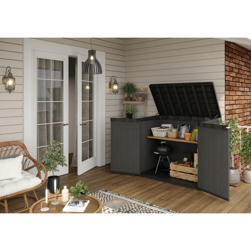 KETER DARWIN 1150L je dizajnová a praktická záhradná skrinka dostupná v farbách zelená, hnedá alebo šedá. Vďaka veľkému úložnému priestoru s objemom 1 150 L je ideálna na uloženie záhradného náradia, športového vybavenia, doplnkov alebo dokonca odpadkových nádob. Elegantný dizajn s povrchom pripomínajúcim drevo dodáva záhrade alebo terase štýlový vzhľad, zatiaľ čo odolný materiál EVOTECH zabezpečuje dlhú životnosť.
