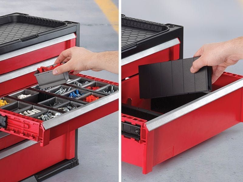 - Hlboká zásuvka s vyberateľnými prepážkami uľahčuje skladovanie väčších a ťažších nástrojov.