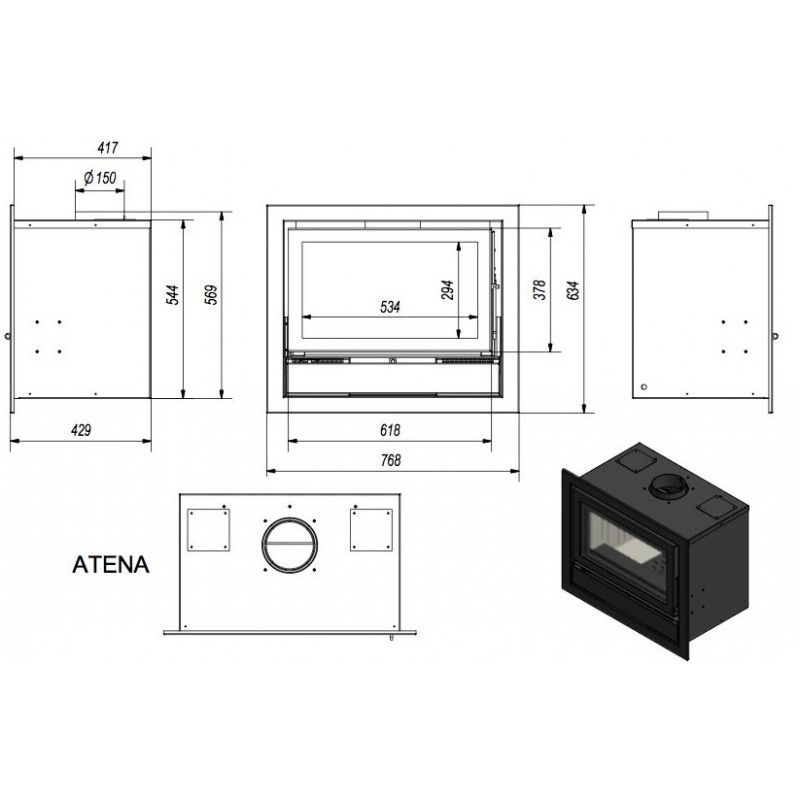 KRATKI ATENA 12 kW, krbová vložka teplovzdušná, rovné skloDvojplášťová oceľová krbová vložka Atena 12, vhodná aj k zabudovaniu do otvorených krbov, vysoká účinnosť horenia, trojitý systém prívodu vzduchu do ohniska: