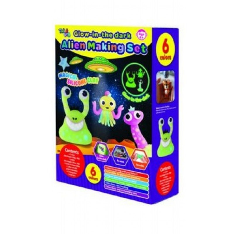 Lowlands Silikónová sada Mimozemšťan svietiace v tmeBalenie obsahuje 4 balenia silikónové modelíny (20g) a 2 balenia (10g), 2 pomôcky, 3 vykrajovačky, 4 hýbací oči, papier na pečenie a hraciu plochu.
